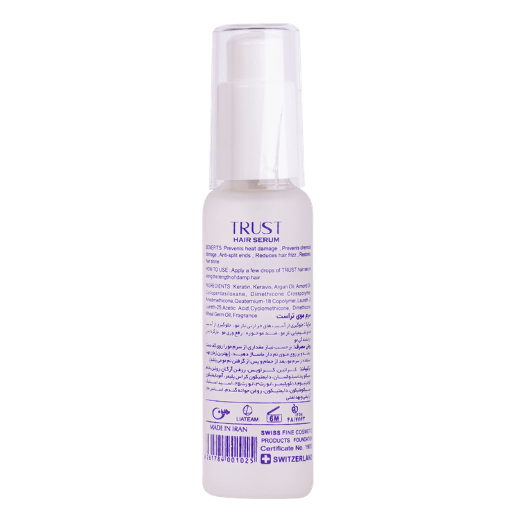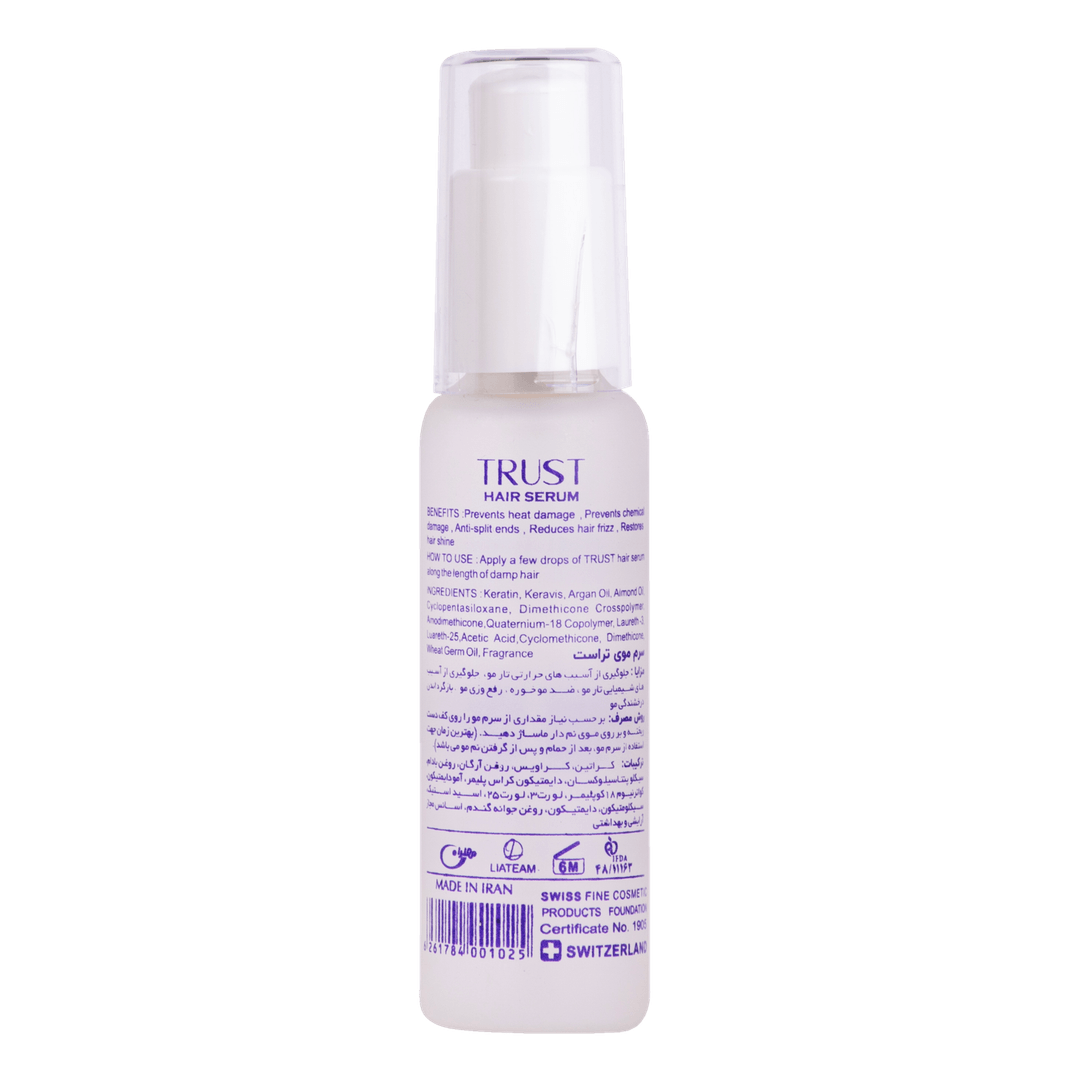 موادموثره در سرم موی تراست، روغن آرگان، کراتین، روغن بادام و جوانه گندم است.