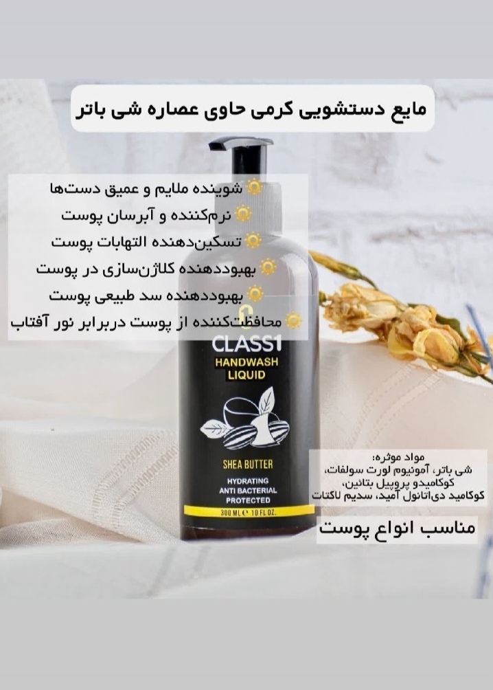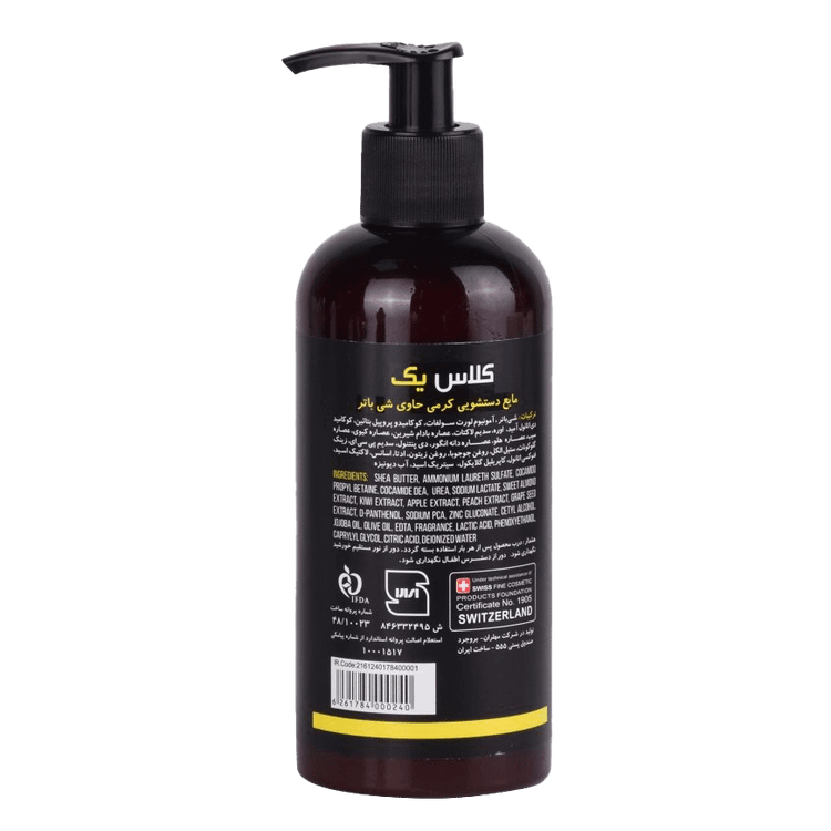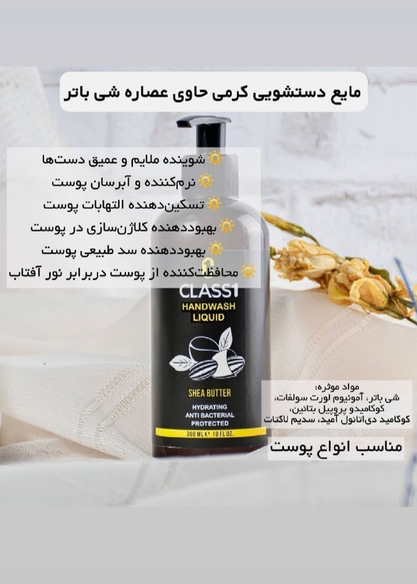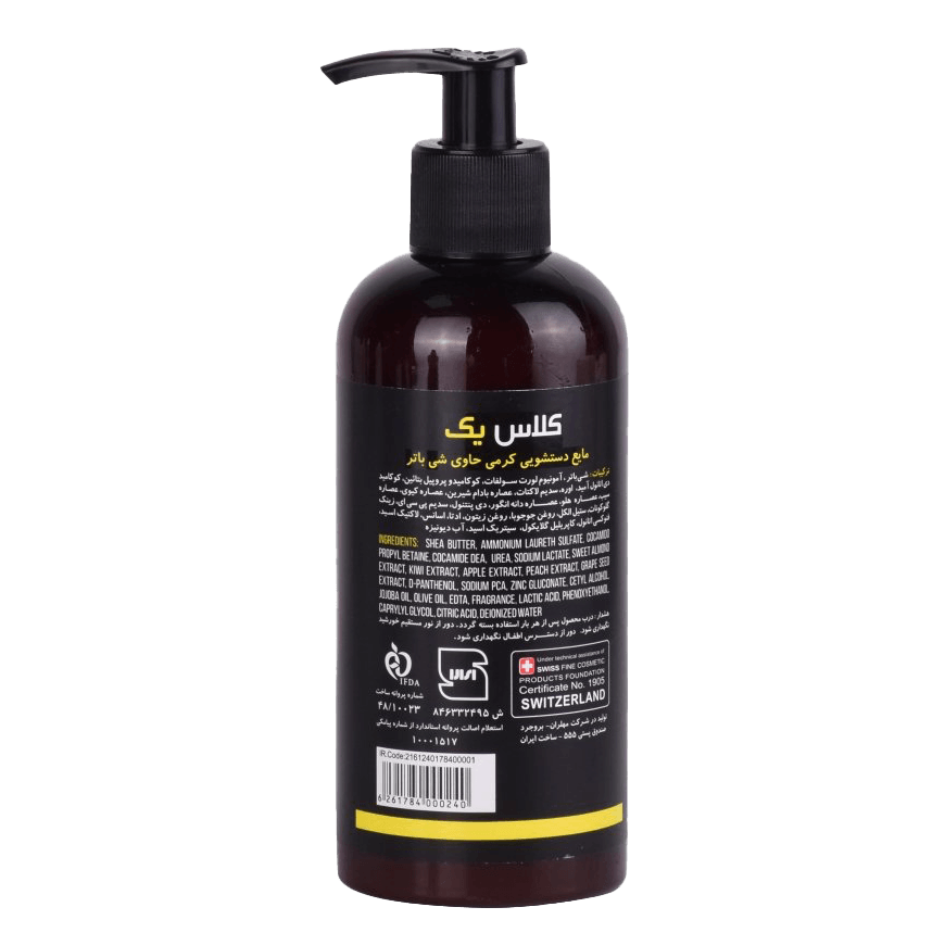 مایع دستشویی کرمی کلاس یک حاوی عصاره شی باتر، علاوه بر پاکسازی پوست از آلودگیها، آن را بهخوبی نرم کرده و آبرسانی میکند. شی باتر موجود در این محصول با داشتن اسیدهای چرب ضروری، سد طبیعی پوست را نیز تقویت می کند.