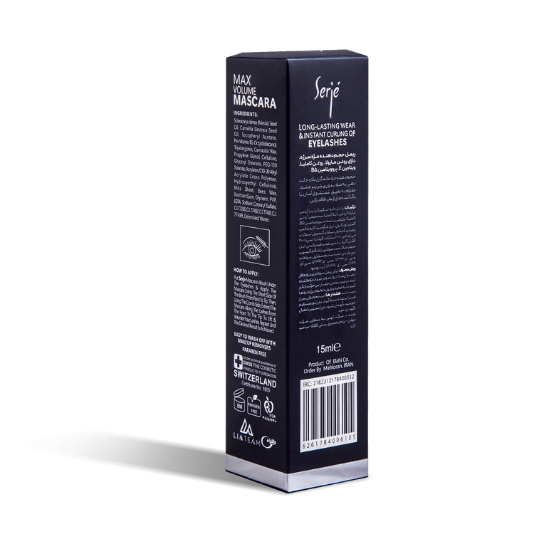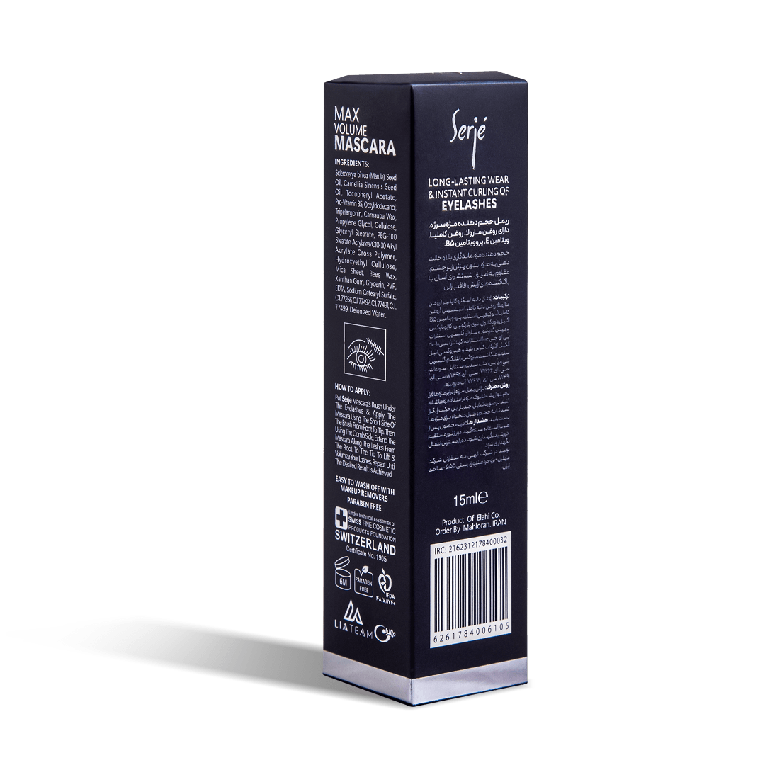 مزایا: حجمدهنده مژه ماندگاری بالا و حالتدهی بدون ریزش زیر چشم مقاوم در برابر تعریق شستشوی آسان با پاککنندههای آرایش فاقد پارابن