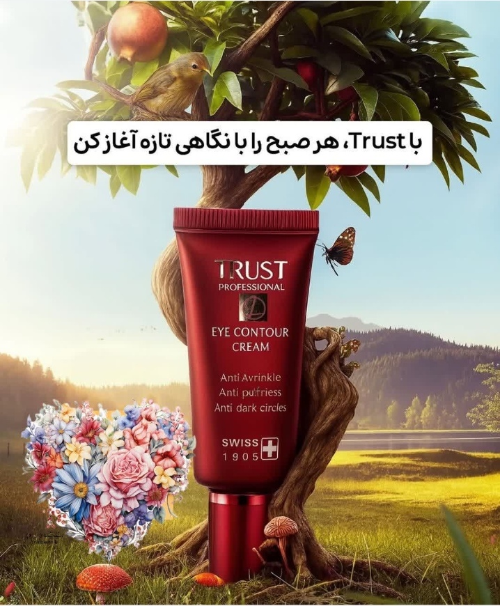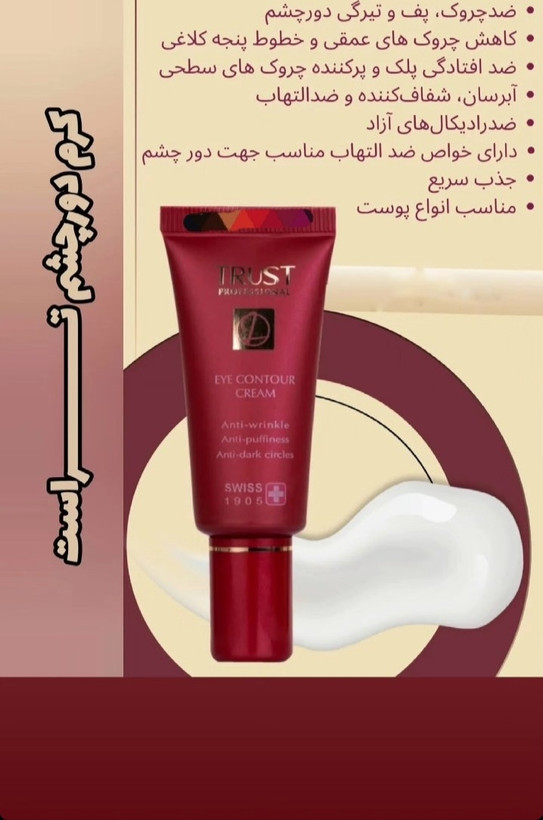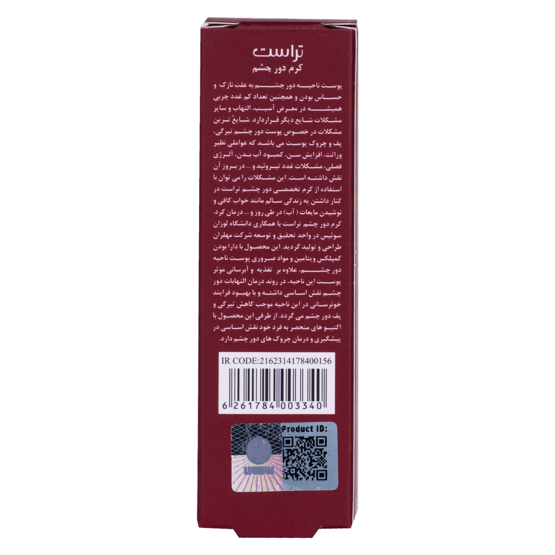 نحوه مصرف: شبها و صبحها کرم دور چشم تراست را روی پوست زیر چشم و اطراف چشم قرار داده و به آرامی تا جذب کامل آن از سمت داخل به خارج به صورت ضربهای ماساژ دهید